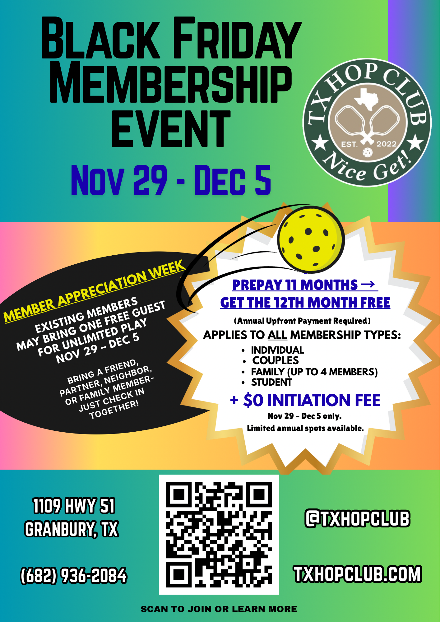 Enjoy a full year of pickleball and save with our biggest holiday deal of the season.