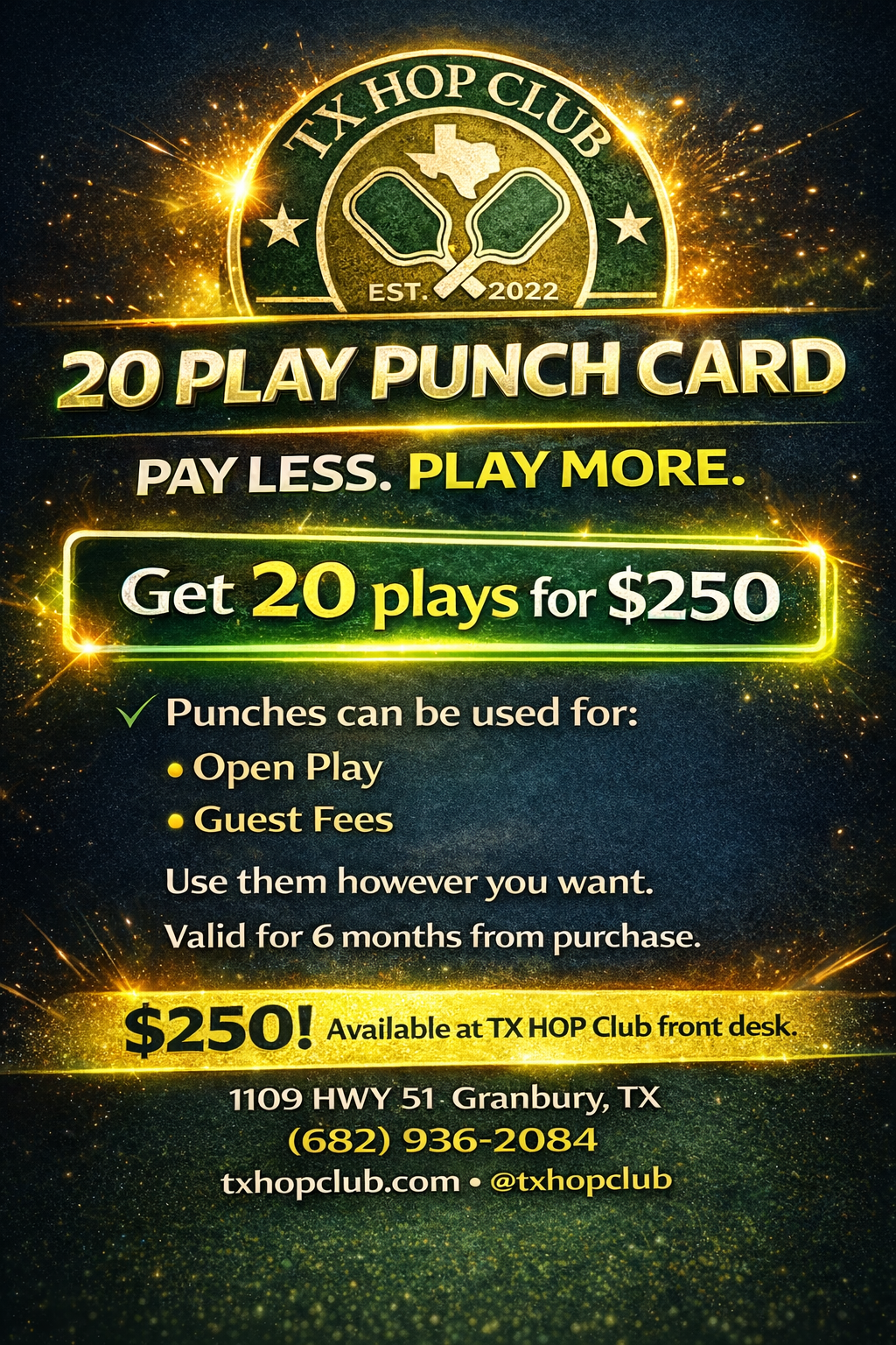 The 20 Play Punch Card is a simple, flexible way to play more at TX HOP Club.