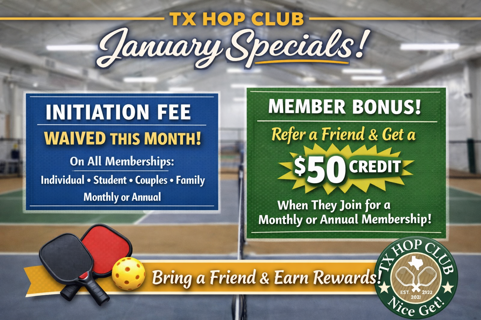 Throughout the year, TX HOP Club offers seasonal specials that make it easier to get on the courts, bring friends, and commit to playing more consistently.